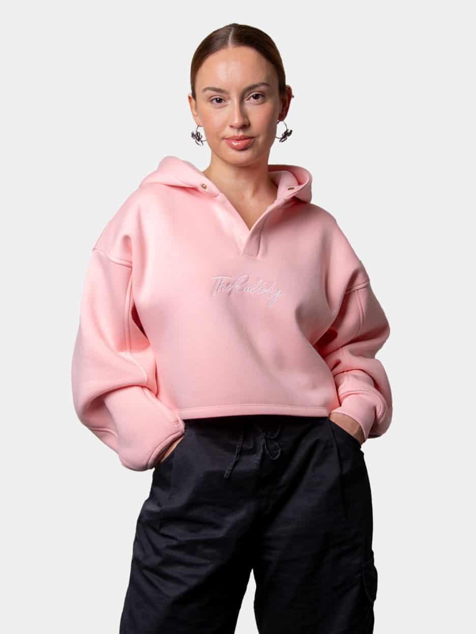 The Bulldog Cropped College Hoodie—a sporty, stylish crop top, made from a comfortable blend of 70% cotton and 30% polyester.
