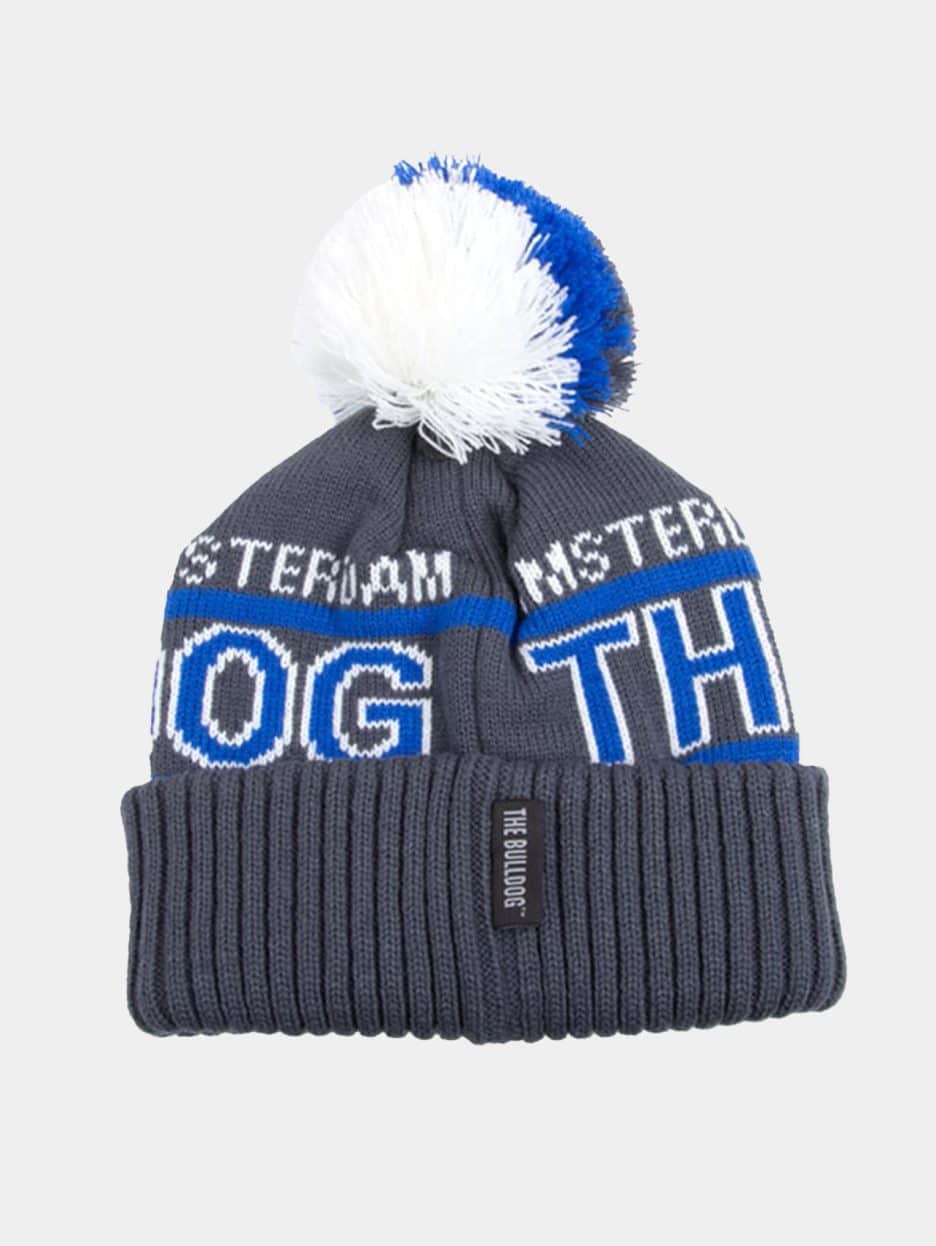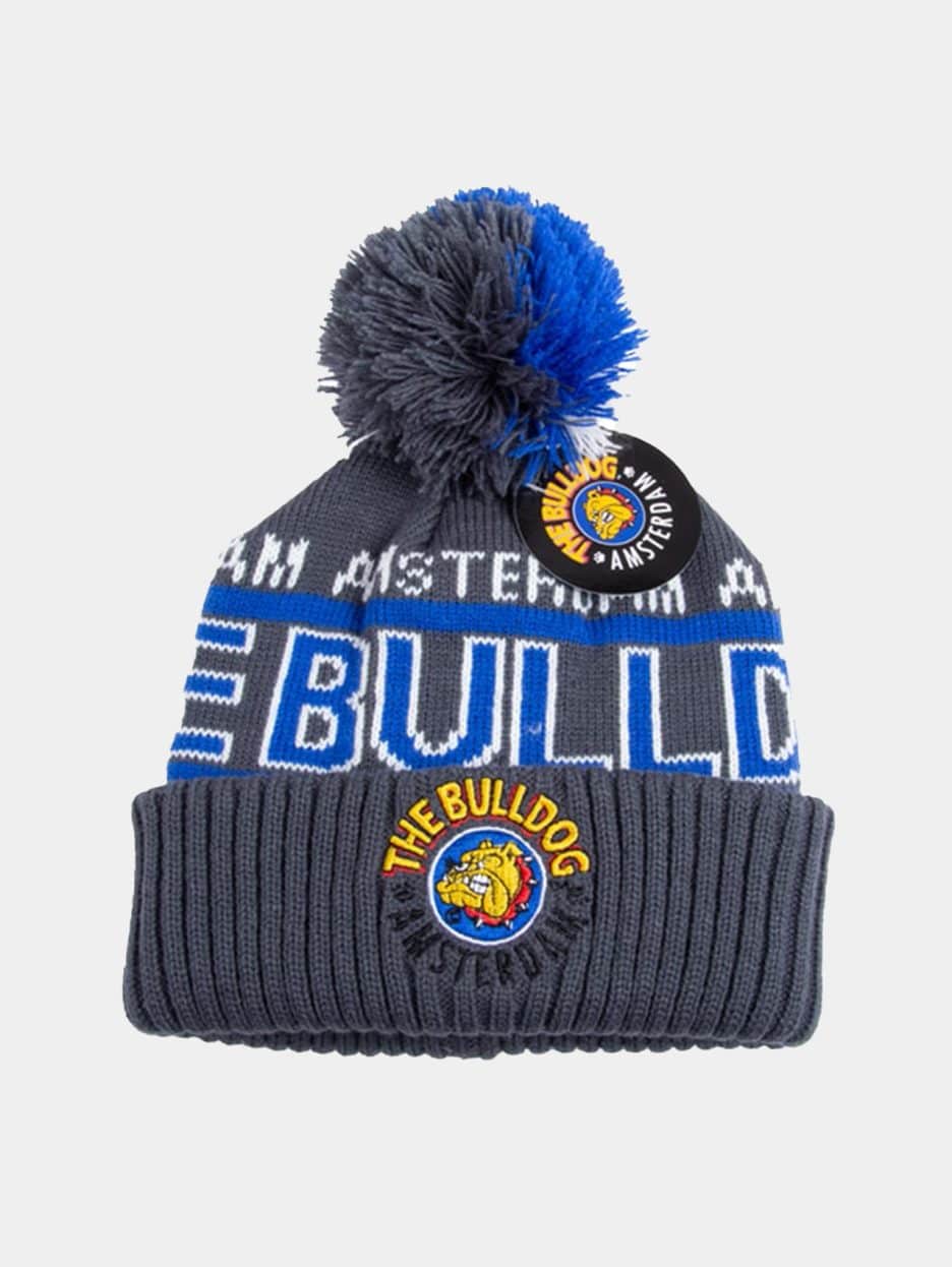 The Bulldog Winter Beanie Grey/Blue/White Logo is made from 100% Acryl to keep you nice and warm. The beanie is fully embroidered with the classic logo and text and with a large bright pompom on top.
