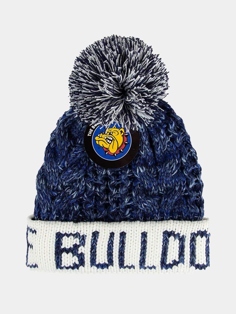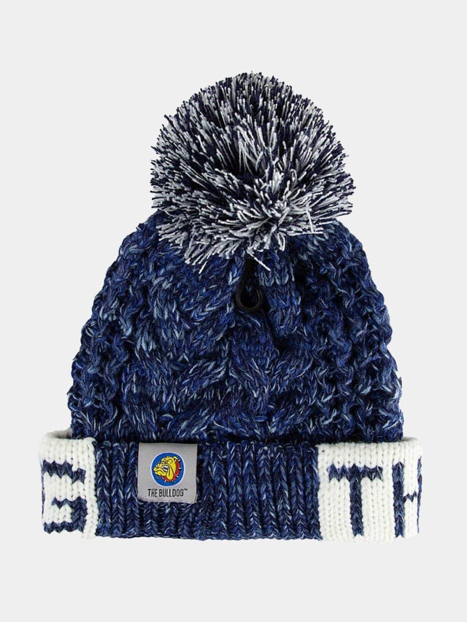 The Bulldog Winter Beanie Blue & White with a large pompom on top