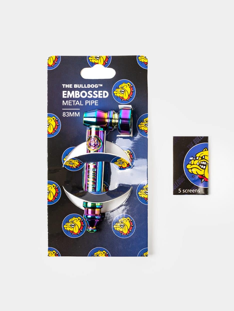 The Bulldog Metal Pipe Set Rainbow. Stylish embossed metal pipe with The Bulldog logo. Extra Screens are included.