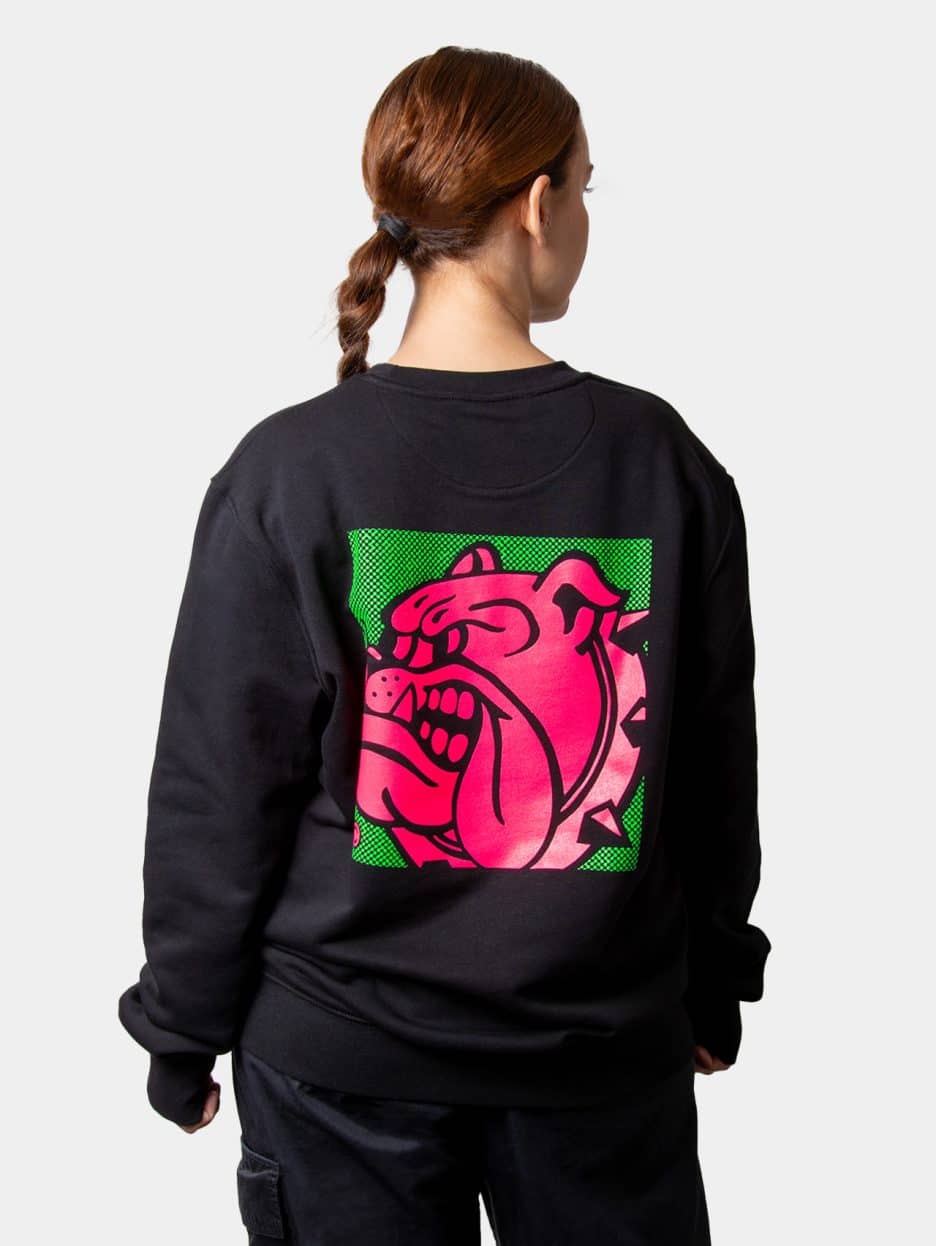 The Neon Sweater Head in Pink is crafted from 85% organic cotton and 15% recycled polyester, combining sustainability with style. It features a bold screen-printed neon Bulldog head design on the back and "The Bulldog" text on the chest. For lasting quality, we recommend washing it inside out and air drying.