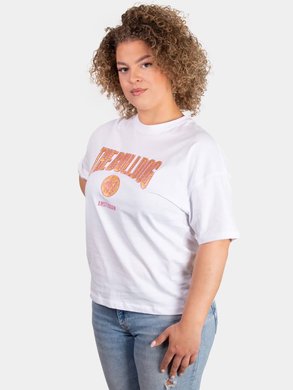 The White Sattin Effect T-Shirt for women is made from 100% cotton featuring orange‑pink satin patch “THE BULLDOG” lettering, an embroidered logo, set‑in sleeves and inside neck tape.
