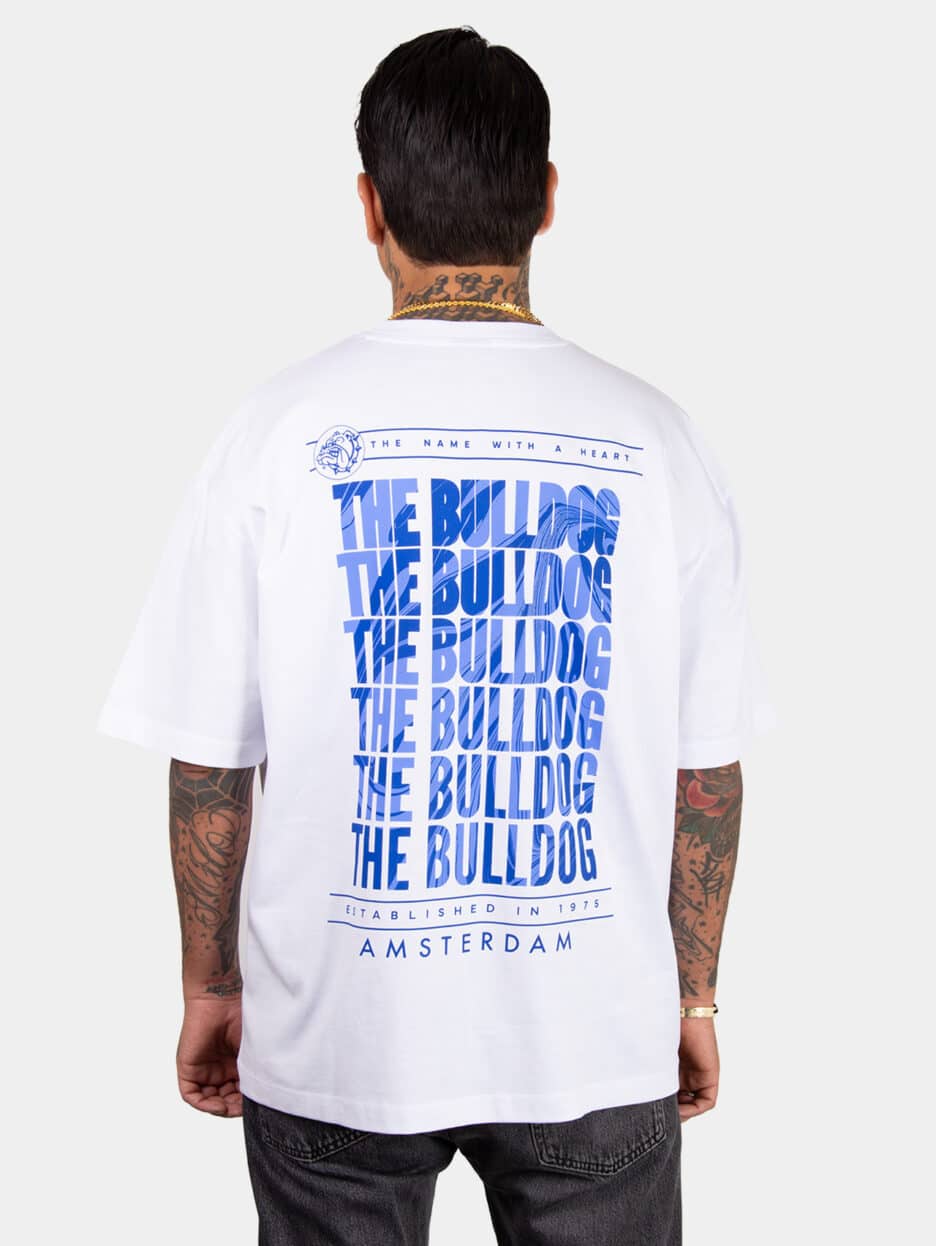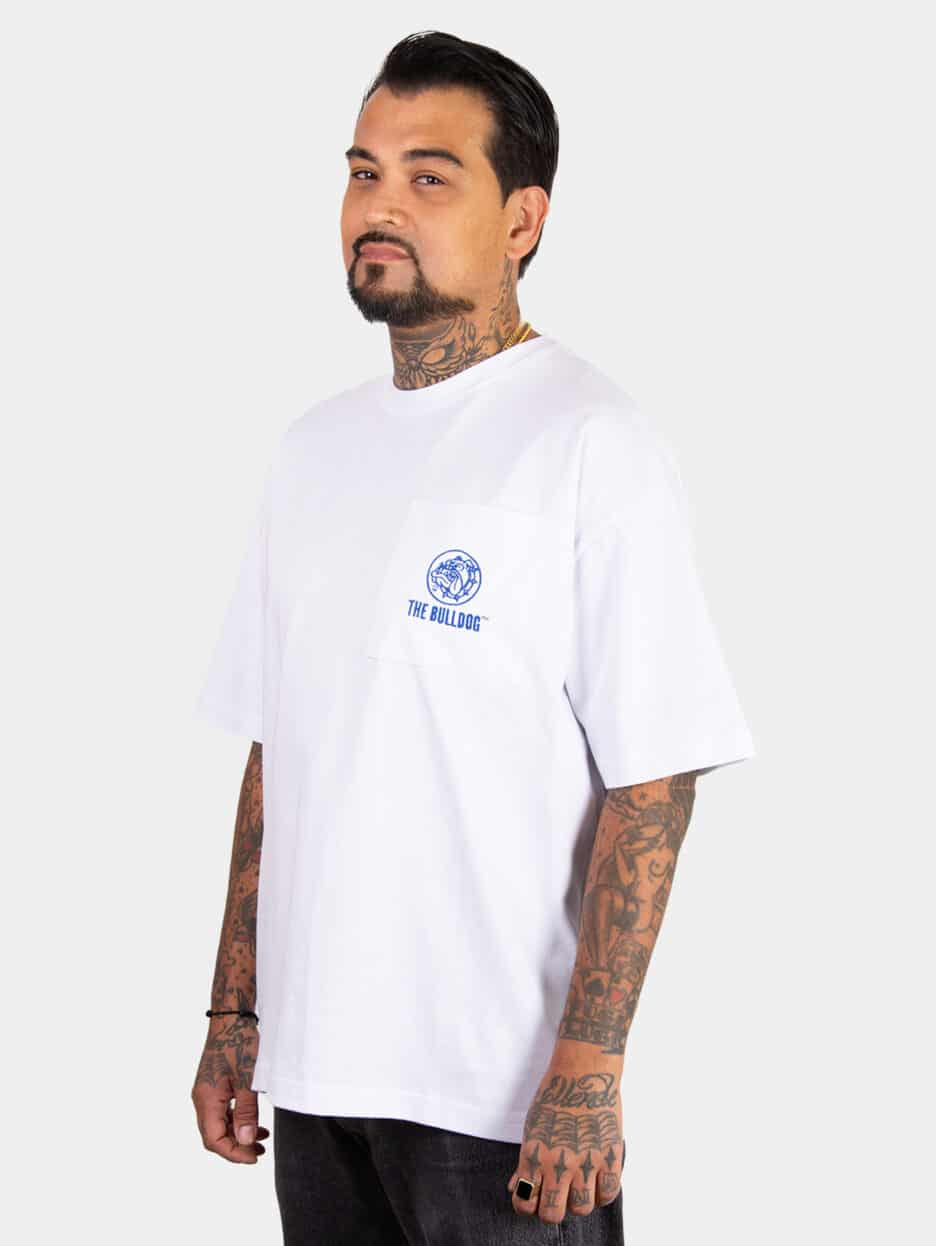 Oversized t-shirt in White made from 100% heavyweight cotton, featuring a chest pocket with embroidered The Bulldog logo and a one-color The Bulldog print on the back in cobalt blue.