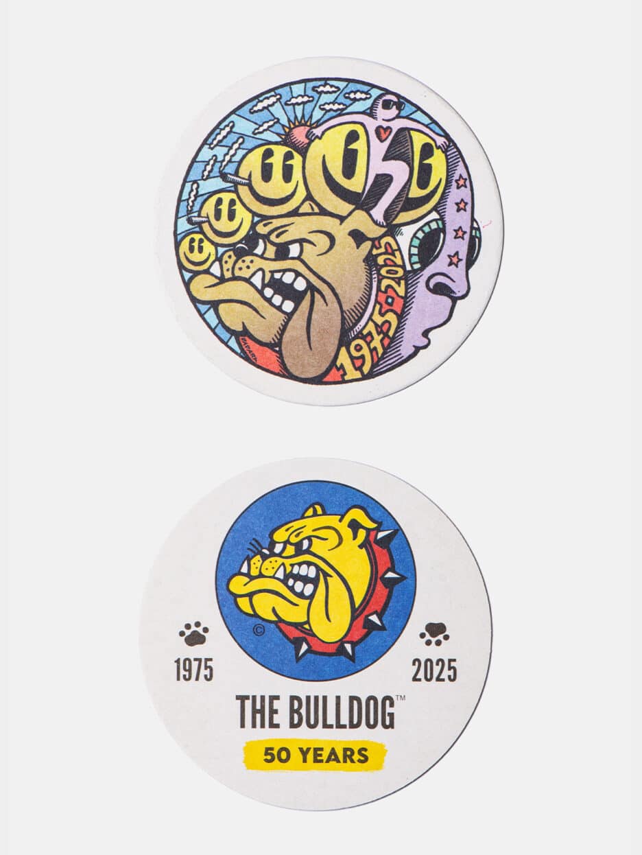 Celebrate 50 years of The Bulldog with this exclusive set of anniversary coasters, designed by the renowned artist Dadara. Made from high-quality pressed paper, these coasters are both durable and stylish, featuring vibrant and unique artwork that captures the essence of The Bulldog’s legacy.