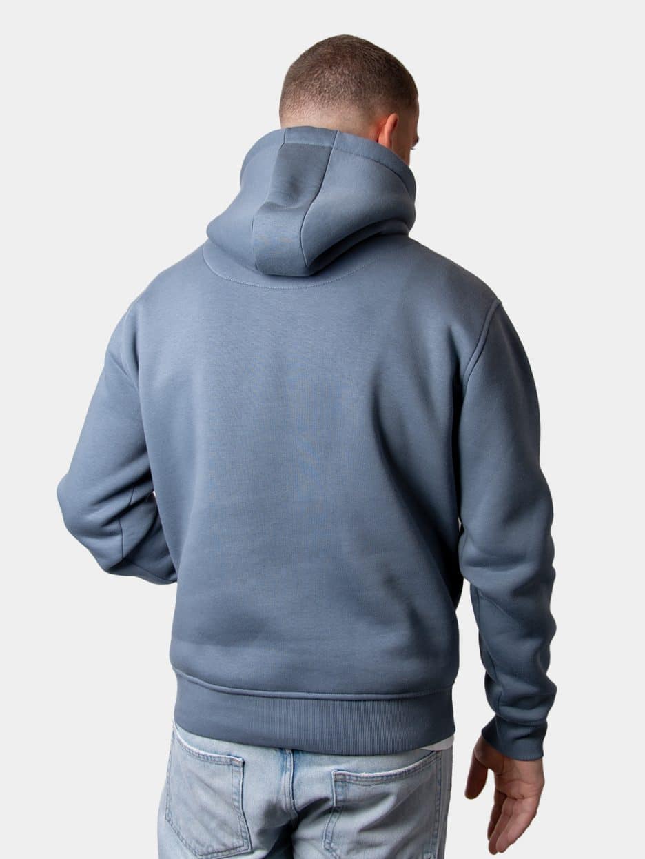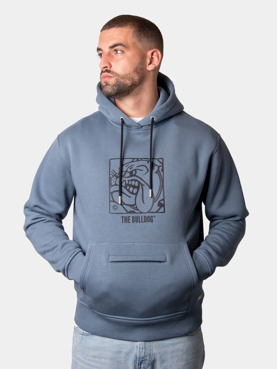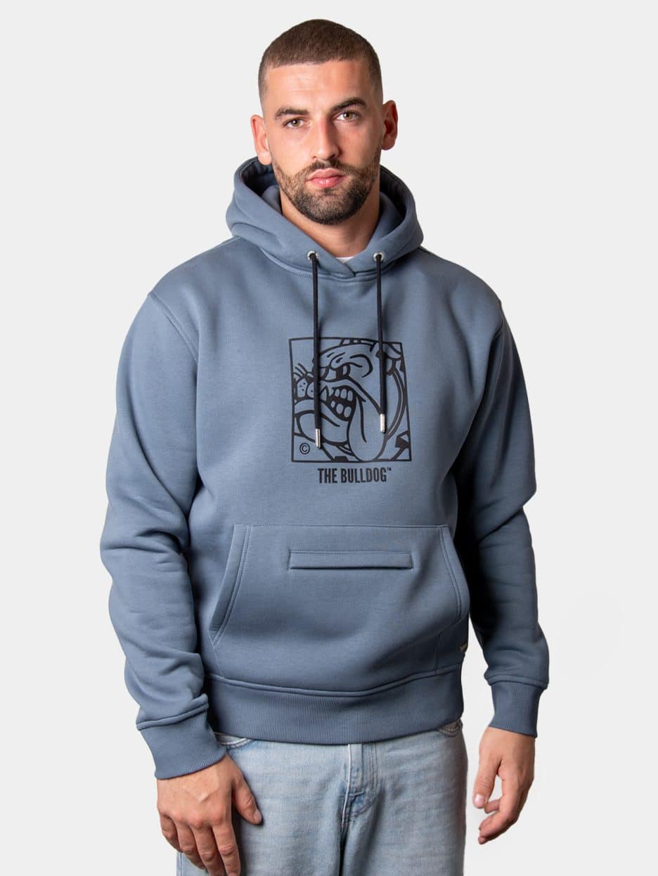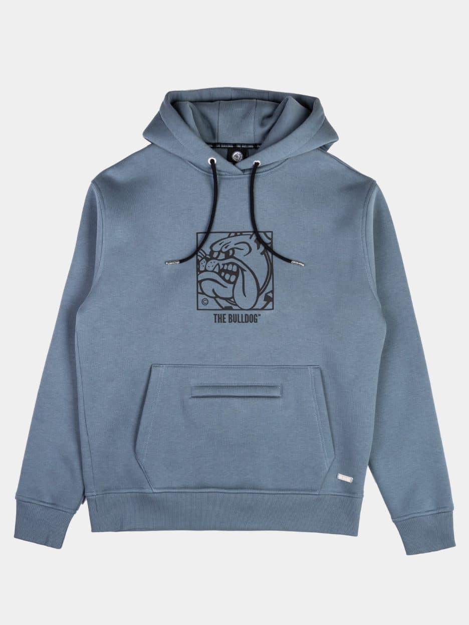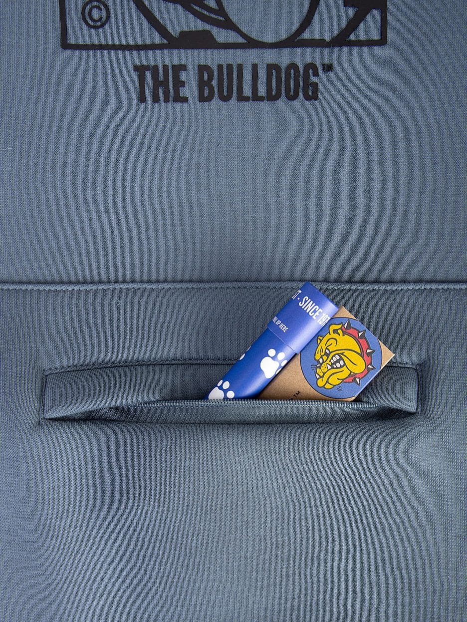This blue-grayish hoodie features a high-definition rubber print on the front, showcasing a squared Bulldog logo. Made from a durable blend of 70% cotton and 30% polyester.