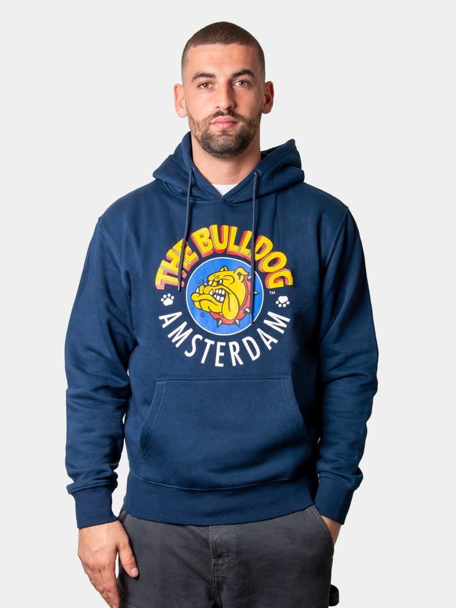 The Bulldog Original Hoodie Navy has a full colour logo and kangaroo pocket.