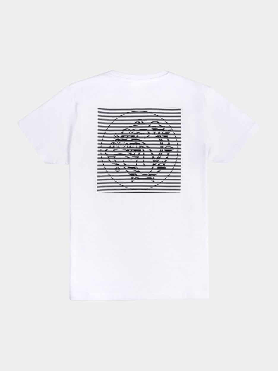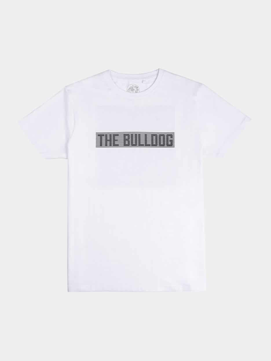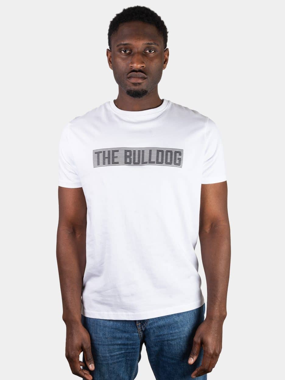 This regular-fit T-Shirt in White is designed for a true-to-size fit, ensuring maximum comfort. Made from 100% cotton, it features a high-definition rubber print with stripes for a stylish touch. The front showcases "The Bulldog" in bold lettering, while the back is adorned with The Bulldog Head design in black and grey, adding a striking detail to this versatile piece.