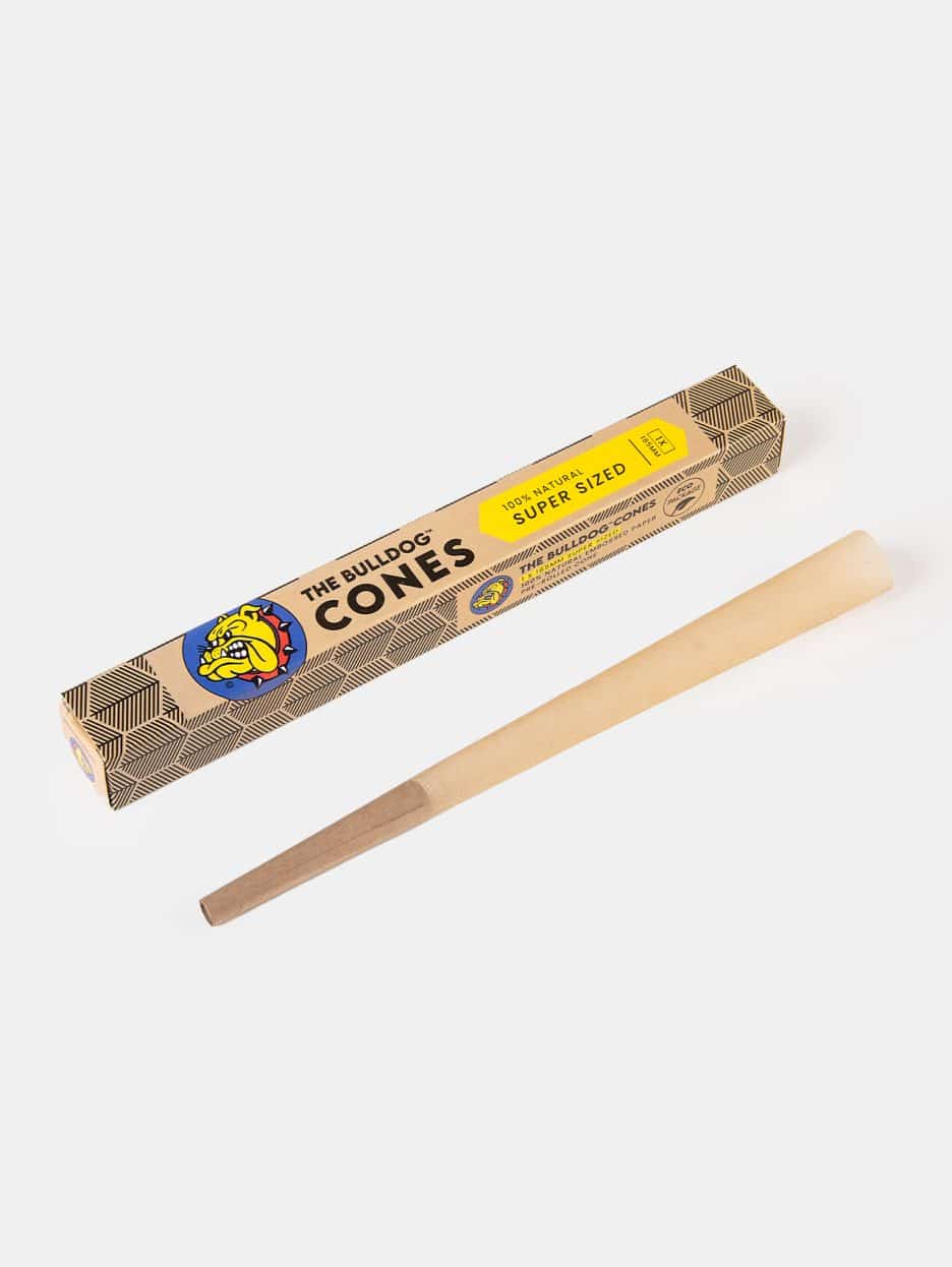 The Bulldog Cones Super Size Unbleached are crafted in the EU using watermarked, unbleached paper with eco-friendly kraft packaging. Each pack contains one pre-rolled cone, ready to be filled, offering a convenient and easy-to-use alternative to rolling papers. Designed for consistency, they ensure the perfect roll every time. A full display contains 25 cones.