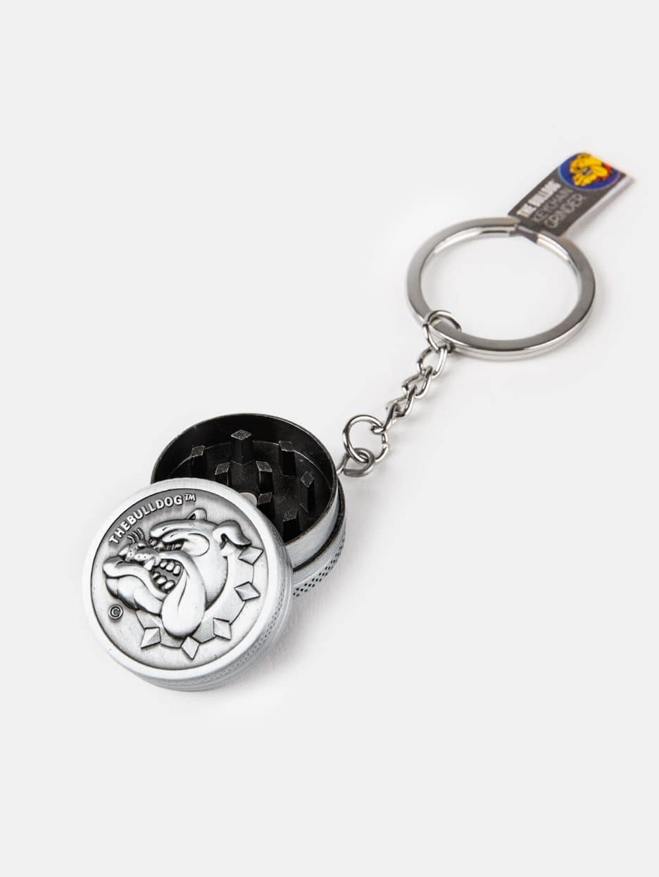 The Bulldog 2-Part Keychain Mini Grinder Worldwide with diamond teeth and embossed international logo on top.