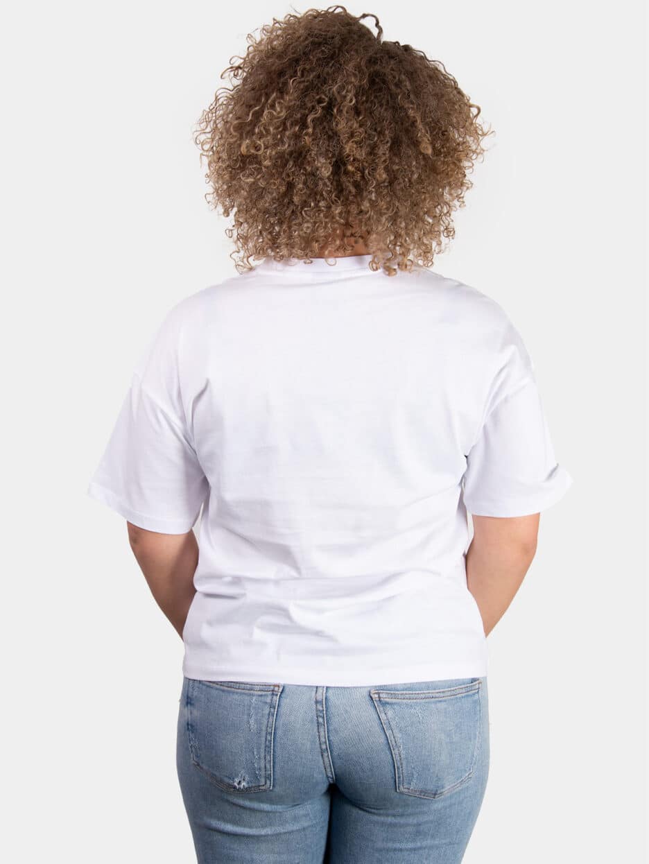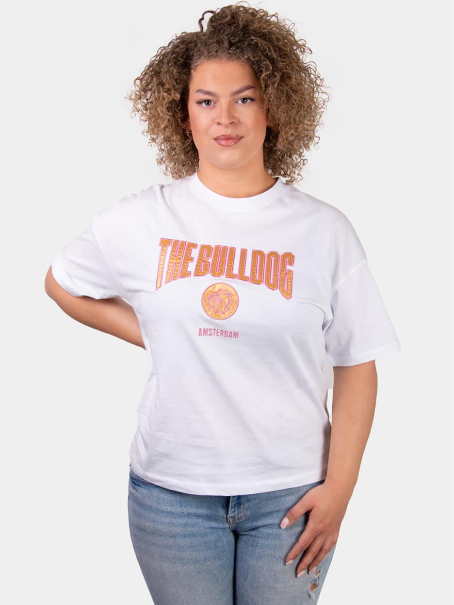 The White Sattin Effect T-Shirt for women is made from 100% cotton featuring orange‑pink satin patch “THE BULLDOG” lettering, an embroidered logo, set‑in sleeves and inside neck tape.