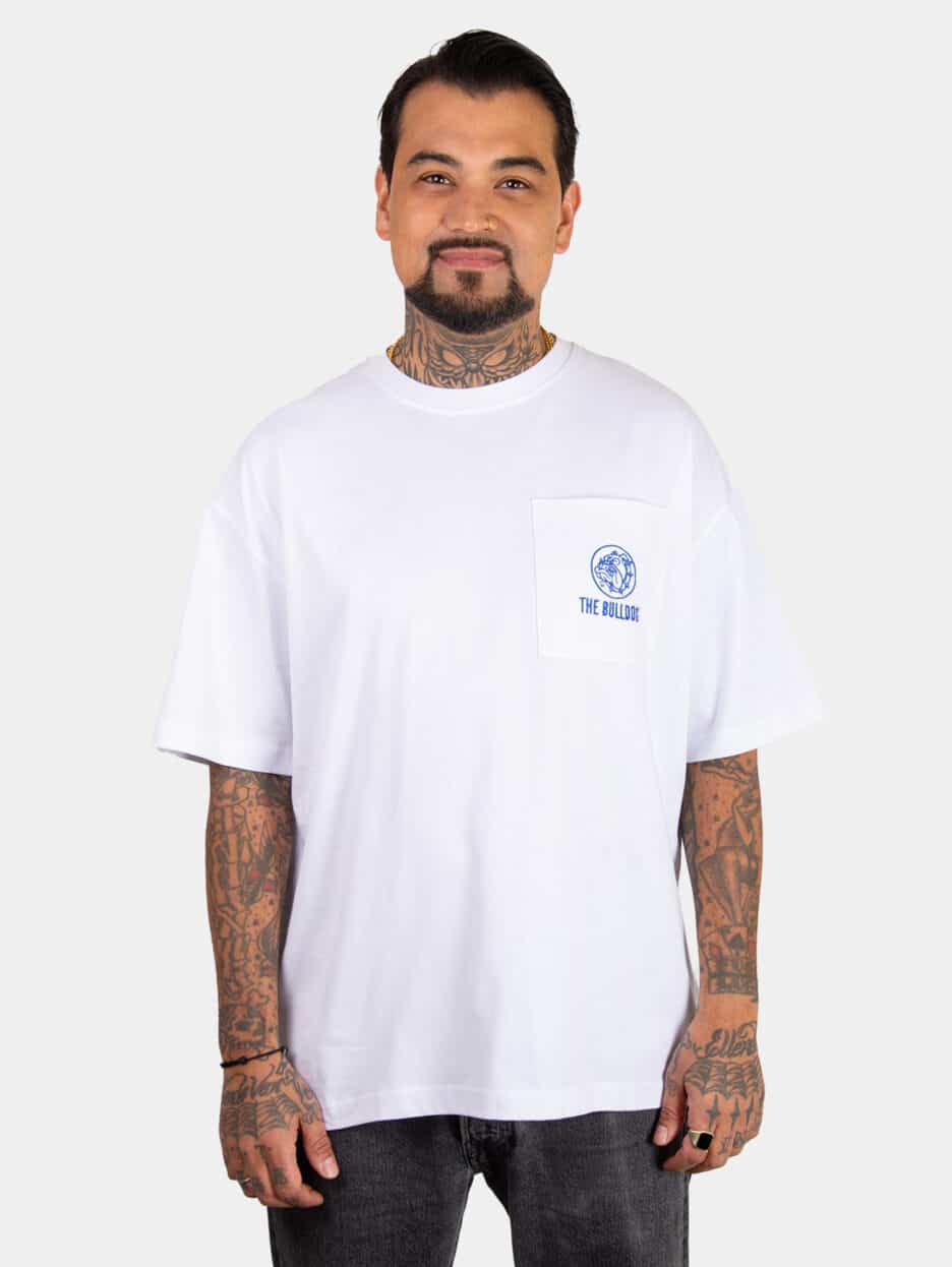 Oversized t-shirt in White made from 100% heavyweight cotton, featuring a chest pocket with embroidered The Bulldog logo and a one-color The Bulldog print on the back in cobalt blue.